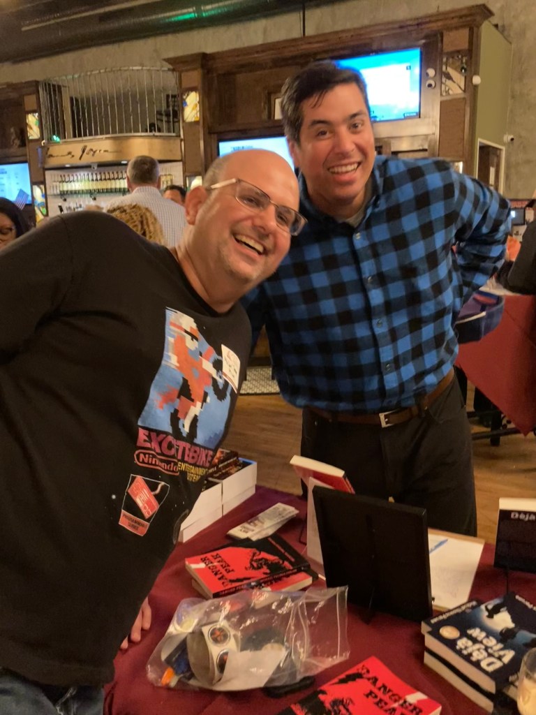 By far, the highlight was the surprise appearance of the guitarist from my old ska/punk band you’ve never heard of called All Out Riot. (I used to play sax and occasionally sing and rap during my younger days.) We hadn’t seen each in years, and it was great catching up. I also discovered that Danger Peak was being sold at a bricks-and-mortar Barnes & Noble in Nashville, Tennessee, where he was living for a short time. So I’m still learning things about my books several years into this process. You can see a photo of the two of us below.