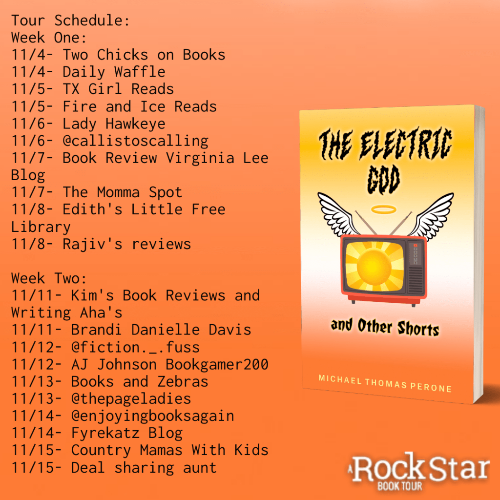 The Electric God and Other Shorts is going on tour! A virtual one, to be specific, and a blog tour to be even more precise. What exactly is a blog tour? Well, I wasn’t sure last year when Déjà View went on one, and I’m still not entirely certain, but we’re going to find out together! Again! From today, November 4th to Friday, November 15th, Rockstar Book Tours is hosting my latest book for a blogging blitzkrieg. These bloggers will review the book, offer excerpts from one story (my favorite one), and even interview me. I’ll also occasionally be making some guest posts myself. On top of all this, some blogs will be giving away one of 10 free copies of The Electric God, so make sure you check out their blogs to enter the giveaway. Here are the blogs and dates, in order, as well as pertinent information about what they’re going to be covering regarding my book (I suppose this answers my question about what a blog tour is):