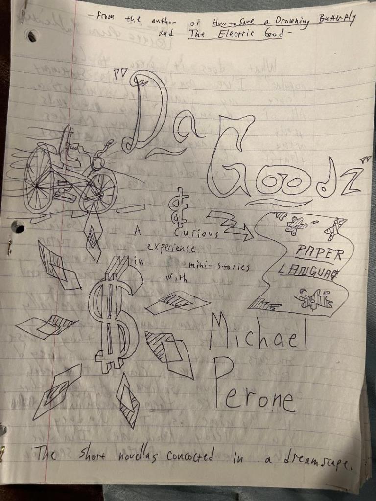 That squiggly drawing on the left side of the page is supposed to be a bicycle. I like how I wrote “From the author of How to Save a Drowning Butterfly and The Electric God” at the top of the page. Little did I know that I would one day combine those stories and Paper Language into its own book over 25 years later. Also, apparently, according to the short note written at the bottom of the page, I came up with these stories in a series of dreams. I would’ve never remembered that had I not written it down.